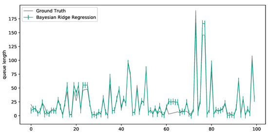 In addition to the heuristic just described and the two approaches that follow, another perspective is considered as a kind of reference method to evaluate the quality of the newly introduced approaches. This method does not try to predict the queue length for , but looks at the queue at time . The length is calculated by simply counting and adding up the waiting jobs before the next process. Thus, the approach neglects the leaving jobs and arriving jobs from Equation (7) and is hence based on the assumption that no large state changes occur between the times and . In general, this method can be declared as the current State-of-the-Art (SotA) in the determination of queue lengths.