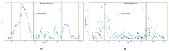 One of the most promising problems to be tackled with the presented methods is the improvement of time constraint adherence in semiconductor manufacturing. Moreover, the general queue length reduction can be facilitated by better predictions. One way to do so could be the inclusion of information about nodal events, such as machine breakdowns. As shown in Figure 5, failure events and queue length by visual comparison can have a strong influence on transition times and the length of queues themselves.