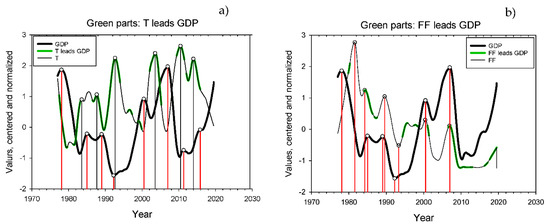 The Federal funds interest rate, FF, the Yield curve, T, and GDP. (a) Green portions of the curve, T, shows where T leads GDP. (b) Green portions of the curve, FF, shows where FF leads GDP. The drop-down lines allow a comparison of peaks and troughs in the two time series. Peaks and troughs are identified from the numerical time series.