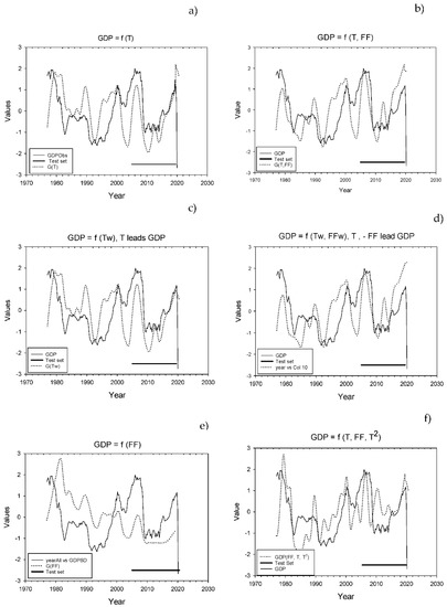 Comparison of Observed GDP with calculated and normalized GDP under different restrictions on the variables in the learning set. (a) GDP = f(T). (b) GDP = f(T, FF). (c) GDP = f(Tw), Tw indicate that both time series are restricted to periods when T is leading GDP. (d) GDP= f(Tw, FFw), Tw and FFw indicate that GDP, T and FF are restricted to time windows where both T and −FF lead GDP. The thick line to the lower right indicates the test set. (e) GDP = f(FF). (f) GDP = f(T, FF, T2).