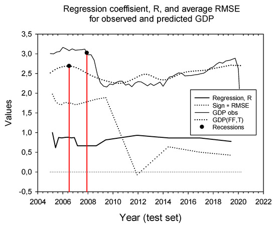 We applied Equation (b), GDP = f(T, FF), to the full series, the test set and the recessions. For the full series, we obtained an RMSE of 0.975, which corresponds to 73% of the test statistics (0.975/ 1.334 = 0.73). For the test set, we obtained an RMSE of 0.356, which corresponds to 30% of the test set statistics (0.356/1.18 = 0.30). The 2008 recession (in the test set) obtained an RMSE of 13% of its test statistics, and all five recessions obtained an average RMSE of 21% of their test statistics.