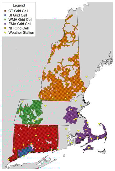This study involved the creation and comparison of two separate machine-learning models designed to predict thunderstorm-related power outages, using data from NWP-based weather simulations and a wide range of other data sources in a region covering three states: Connecticut, Massachusetts, and New Hampshire, and five distinct electrical utility service territories: Eversource Connecticut (CT), Eversource Western Massachusetts (WMA), Eversource Eastern Massachusetts (EMA), Eversource New Hampshire (NH), and AVANGRID United Illuminating (UI). For geographical details of the modeling domain, refer to Figure 1.