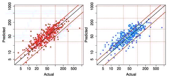 Scatterplots of cross-validation predictions versus actual outages for all thunderstorm events for RTMA- (red, (left)) and WRF (blue, (right))-based outage prediction systems.