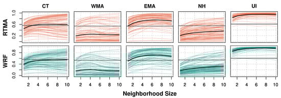 where FSS is the total of the derived binary raster, divided by the number of cells in the domain [67]. For precipitation, the threshold tends to increase with smaller domains and as the prevalence of precipitation increases [69]. For this analysis, we calculated the FSS for each storm by service territory for a range of scales (3 × 3 to 21 × 21 cells), and outage thresholds between upscaled outage predictions and actual outages via the validation library [70]. Upscaling the predicted and actual values for the FSS calculation was important because the resolution of our model and the frequency of actual damages is such that the actual values are extremely zero-inflated and very sparse (96.3% zeros, and mean of 0.048 damages per grid cell). The outage model predictions however, tend to be small (median of 0.0292 and 0.0314 for RTMA and WRF systems respectively) and are more evenly distributed. This difference in spatial distribution was minimized by applying boxcar smoothing to a small 3 × 3 neighborhood on both the actual and predicted outages for each event and territory via the SpatialVx library [71]. While this process effectively degrades the precision of the analysis, it generates more continuously distributed values that are more comparable, while not affecting the total number of damage locations for each event.