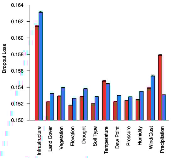This suggests that the randomness of storm damages is quite significant, and more precise outage predictions may require significantly more precise information. One possibility is that additional factors that are not considered in this study, such as the age of the infrastructure, limit the outage model. However, there are also differences between the two models that suggest other possibilities. As described above, the spatial resolution of the representation of the weather data is a readily apparent source of imprecision in our data. Although all data used in these models, including the environmental and infrastructure information, may suffer from similar representativeness errors, we can see that some weather variables are better represented at 2.5 km × 2.5 km than others. How the precision of the weather data affects the outage models can be understood with a more detailed analysis of the variable importance.