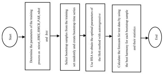 | The obtained forecasts from the updated Equations for bootstrap time series at time is represented by . Forecasts and their statistics are calculated just as in Table 2. In addition, the flowchart of the proposed method is given in Figure 1. |