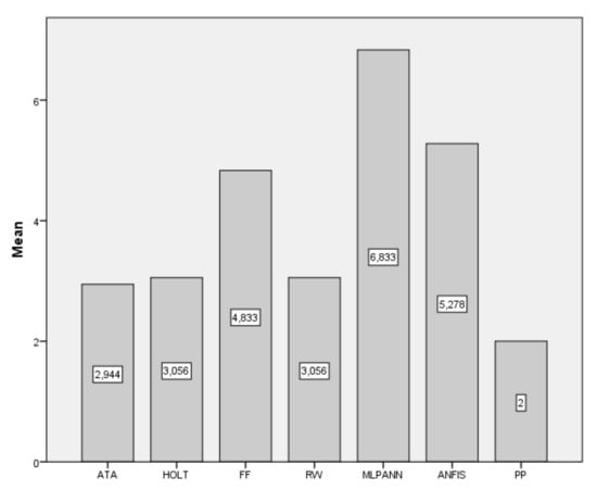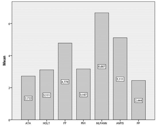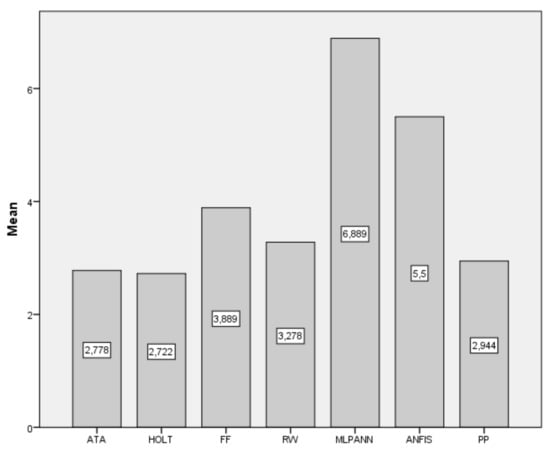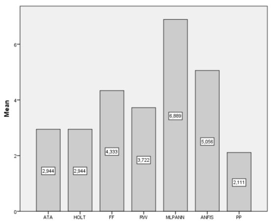 From Figure 2, it is seen that the proposed method has a minimum average rank value compared with other methods, and the proposed method is the best method for RMSE criterion when the length of the test set is 10. In addition, Table 4 gives the all-analysis results for each data set for the MAPE criterion given in Equation (22) when the length of the test set is 10.