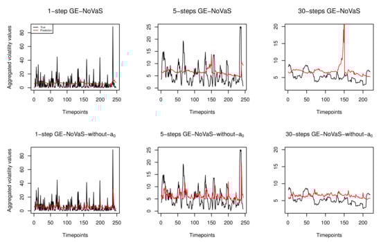 From Figure 1, we can clearly see that the GE-NoVaS-without- method can better capture different steps’ true time-aggregated features. On the other hand, the GE-NoVaS method returns unstable results for 30-step-ahead time-aggregated predictions. Besides, we can see that the 1-step-ahead POOS prediction returned by the GE-NoVaS method is almost a flat curve, which is actually meaningless. Similarly, for the 5-step-ahead time-aggregated prediction case, the POOS prediction of the GE-NoVaS method fails to match the true time-aggregated values.