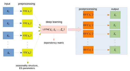 In the remainder of this chapter, we explicitly define the quintessential aspects of MES-LSTM. The description is analogous to that of Smyl [2], with relevant extensions made to suit our multivariate presentation. Our model comprises two distinct layers: an exponential smoothing layer inside our preprocessing module, and an LSTM layer used for learning the dependency between the covariates. This methodology is consistent with Section 1.1, where we outline our choice to expand upon Harvey’s approach [15] over the Pfeffermann and Allon [16] approach for multivariate exponential smoothing.