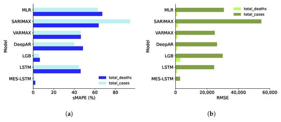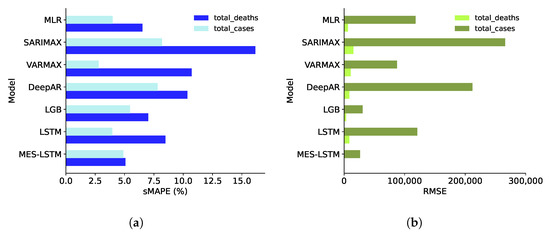 MES-LSTM Forecast Accuracy Ranked for Each Country in the SADC Region. (a) sMAPE for total cases. (b) sMAPE for total deaths.