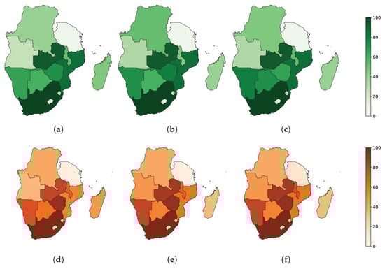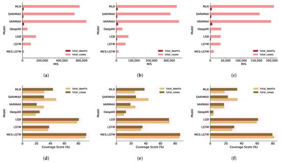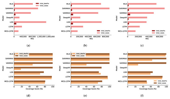 MES-LSTM Prediction Interval Accuracy (normalized MIS) Ranked for Each Country in the SADC Region. (a) total cases (). (b) total cases (). (c) total cases (). (d) total deaths (). (e) total deaths (). (f) total deaths ().