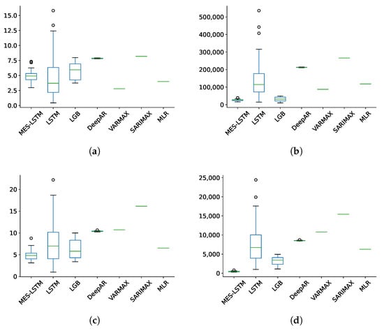 We note in terms of forecasting accuracy (Table 12 and Table 13) in each instance that the null hypothesis w.r.t. both predictands is rejected at the level of significance, except for LSTM, LGB, VARMAX, and MLR. This may seem contrary to previously presented results in this section, but the box plots in Figure 5 explain this. Although the core and lower distributions may overlap (the box and bottom whisker) for the distributions in questions compared to MES-LSTM, the higher levels of inaccuracy are only reported for the benchmarks, i.e., the upper whiskers for the benchmarks peak higher than MES-LSTM.