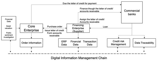 Compared to traditional SCF, an important feature of DSCF is the “enterprise data on the chain”, i.e., the enterprises in the supply chain register and confirming their transaction information on the chain (see Figure 1), which is a different way of digitizing enterprises than the internet (Goldfarb and Tucker [25]). For the realization of this feature, the digitalization of both financial institutions and enterprises is essential, with the digitalization of enterprises also playing an important role in the risk control of SCF. Firstly, the information recording, IoT technology, plays a role in collecting and recording information, warehouse management system (WMS), supplier relationship management (SRM), customer relationship management (CRM), etc., which are all supply chain information collection and recording systems. Secondly, the dissemination of information, in digital form, makes it possible to share, collaborate, and monitor information in real-time across locations. Enterprise resource planning (ERP), for example, is called the internal information internet of the enterprise. Thirdly, information processing, i.e., the fast and accurate processing of information, e.g., advanced planning and scheduling (APS) is an information processing system for the supply chain management. The new generation platform features intelligent multi-party connection, mutual trust of chain enterprises, multi-level credit penetration and closed-loop ecological risk control, which is expected to drive the development of enterprise financing business in relatively risk-controlled batches by transferring core enterprise credit at multiple levels and closing the loop of funds in an operational manner.