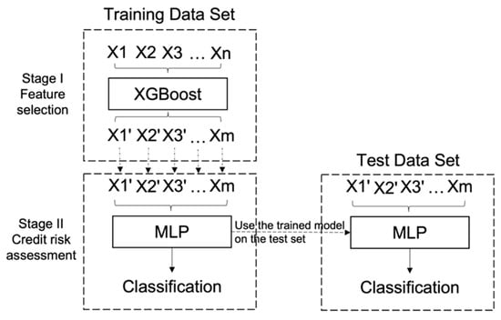 In order to accurately and effectively conduct a credit risk assessment, we construct the following model (See Figure 2). In the first stage, through feature selection, we extract the training sample set and select the features with higher scores based on the importance score of the calculated features. In the second stage, MLP is used for credit risk assessment based on the selected features. As credit risk assessment can essentially be seen as a classification problem, the MLP is used as a classification model in the credit assessment process. Further, the trained model is used to test the test set and ultimately, we validate the proposed research question. Specifically, given the training set , represents the original features as the input of credit risk assessment and is the label of credit status (, i.e., risky/non-risky). . Based on the importance ranking by XGBoost classifier in the first stage, we filter the features by thresholds and remove features where . Then we obtain the remained features in subset as the input for retraining with MLP. Though the -based MLP, as the activation function is more expressive for linear functions. For non-linear functions, does not have the vanishing gradient problem as the gradient of the non-negative interval is constant, allowing the convergence rate of the model to be maintained in a steady-state. Thus, we obtain the output of and the performance of the model.