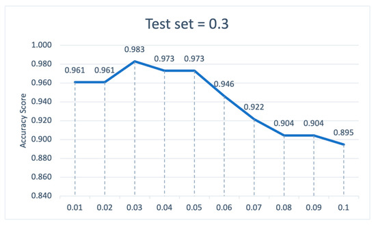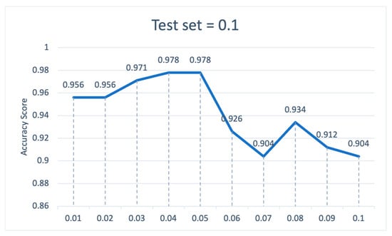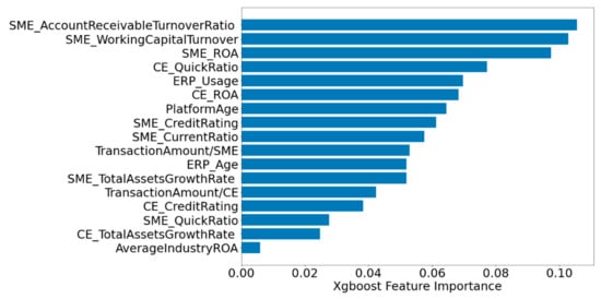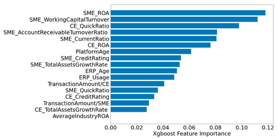 Figure 8 shows the ranking of the feature importance of XGBoost-MLP at a test set of 0.1, with the ROA of SME being the most important feature. More specifically, we find by plotting the variation in model accuracy for different thresholds (see Figure 9) that the model has the highest accuracy of 0.978 when the threshold is at 0.04 or 0.05, i.e., removing the quick ratio of SMEs, the credit rating of CE, the proportion of trading transaction on CE sales or cost, the growth rate of total assets of the core enterprise, and the average industry ROA. It is noteworthy that when the threshold rises to 0.06, the growth rate of total assets of the core enterprise and the average industry ROA is also removed, and then the accuracy of the model decreases significantly and the features removed include ERP age, usage status of ERP, the growth rate of total assets of the SME, and the credit rating of the SME.