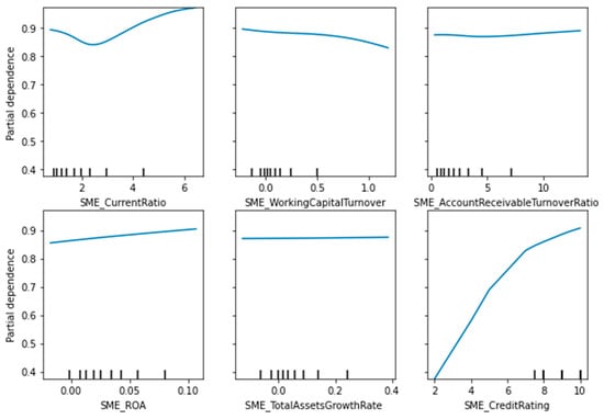 Moreover, this paper uses partial dependence plots (PDP) to analyze the impact of each explanatory variable in the XGBoost-MLP model on credit risk assessment (Scikit-learn in Python is used for the PDP experiment.). PDP was introduced by Friedman [79] which can be used to indicate how one of the features affects the model prediction if all other features are maintained constant. Figure 6 shows the PDP of traditional financing features of SMEs including the current ratio, working capital turnover ratio, accounts receivable turnover ratio, ROA, total asset growth rate, and the credit rating score. The vertical axis of PDP represents the probability that an SME is judged non-risky, and the horizontal axis represents the change in features. Accordingly, Figure 6 indicates that the higher the current ratio, the higher probability of non-risky SMEs, which is consistent with the result of Zhu et al. [31]. Similarly, the impact of accounts receivable turnover ratio and ROA also have a similar trend that the higher ratio, the higher probability of non-risky SMEs. The change of total asset growth rate has a slight impact on the probability though the overall impact of the total asset growth rate remains between 0.85 to 0.9. Moreover, the working capital turnover ratio has the contrary trend of probability changes that the higher the working capital turnover ratio, the lower possibility of non-risky SMEs. The highest probability of non-risky SMEs happens when the working capital ratio is below 1. Generally, the higher the accounts receivable turnover rate, the shorter the period of accounts receivable, which means that the return of funds is guaranteed and the risk of repayment is correspondingly lower. However, for working capital turnover, a high working capital turnover indicates that the company is under-capitalized and has a debt crisis. Based on the sample of the SMEs in the paper, the working capital turnover ratio of SMEs in China is generally low, and although the risk of loan repayment is low, it also indicates low capital utilization and insufficient sales. Additionally, a higher credit rating has a higher probability of non-risky SMEs and the probability increases sharply when the credit rating of SMEs is improved.