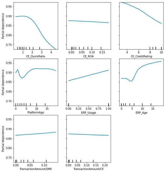 Figure 7 indicates the PDP of DSCF features of SMEs including the features of core enterprise, the digitalization feature of SMEs, and the trading features in the supply chain. There is a decreasing trend of the probability of non-risky SMEs following the increase of CE’s quick ratio, which is consistent with the result of Zhu et al. [31]. The high quick ratio of a core enterprise leads to excessive capital occupation in its quick assets, which are mostly accounts receivable in the supply chain, and this has an impact on its solvency, as there is a certain degree of uncertainty regarding the collection of accounts receivable. Therefore, for SMEs in the supply chain, a core enterprise with a high quick ratio does not enhance its own risk tolerance. It is also interesting to note that a higher return on assets (ROA) of the core firm does not improve the risk-free probability of the SME. Although a higher ROA indicates a better utilization of the assets of the core enterprise, for SMEs in the supply chain, their own repayment ability is more important. Meanwhile, we find that core enterprise with a higher credit rating does not have the higher risk-free probability of SMEs but has the opposite effect. Combined with the fact that the weight of the credit rating of core enterprises is not prominent in the feature importance ranking in Figure 4, we believe that the current source of funds for SMEs in China is complex, and SCF is not the main source of funds for SMEs, which leads to the core enterprises’ own advantage which does not effectively enhance the risk-free probability of SMEs.