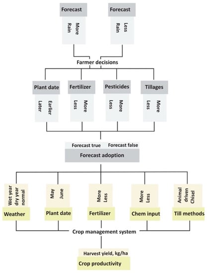 Farmers were surveyed about crop patterns (Figure 2) and farmers’ decisions during less and more rainfall conditions (Table 1). Questions such as “what do you do when there is less rainfall?” and “what do you do when there is more rainfall?” were used, and the interviewer listed the farming activities and farmers’ behaviors as responses to such rainfall conditions. We used agents’ adoption rates [64] coupled with a crop productivity model to assess the impact of farmers’ decisions on agricultural productivity (Figure 3). Farmers’ decisions such as planting date, seed type, fertilizer use, pesticide use, and tillage frequencies were used to crop model (DSSAT). Crop modeling programs helped to conduct different treatment scenarios varying farmer decisions to study maize productivity.