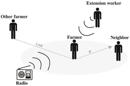 Description of agents’ communication about weather forecast information in the community. Farmers interact with nearby farmers within their radius distances of interaction and links through networking. Agriculture extension workers visit the farmers to exchange weather forecast information. Farmers receive information from radios on a daily basis. Figure is adapted from [64].