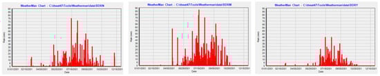 We used Climagen SC to generate weather data such as solar radiation, wind, minimum temperature, maximum temperature, and rainfall for the Bahirdar area based on historical weather data (Figure 5). We retrieved available daily historical weather data for 1961–1988 from NOAA Global Historical Climatology Network V2 [75]. Normal rainfall occurrence is about 1300 mm of rain per year. The more rainfall condition is about 1900 mm and the less rainfall condition is about 900 mm of annual rainfall observed [69].