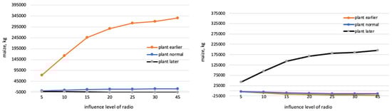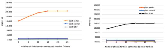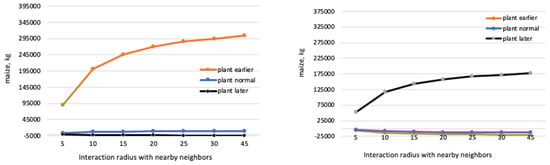 Farmers’ community-added yield, measured as maize in kg, increases proportionally as interaction radius distance increases. It is recommended that farmers interact not only with his/her direct neighbors (15 unit or 700 m radius distance) but engage intervillage interactions in at least 1200 m distance (25 units) [64]. This would add about 300,000 kg (Table 2A) of more maize into the Kebele production if farmers plant early under more rainfall conditions or about 170,000 kg (Table 3A) if they plant late under less rainfall conditions (Figure 7).