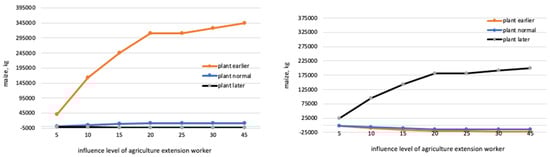 This increase in adoption rates could bring about 200,000 to 350,000 kg of maize into the community (Table A8 and Table A9) (Figure 10). Local government can reach this higher adoption and yield improvement with a 30% improvement of extension service influence and capacity in the Kebele [64]. Fadare et al. [95] studied the factors influencing the adopting decisions of maize farmers in Nigeria. They found 87.4% do not have access to extension service, and the parameter estimates of the model to identify the factors influencing farmers’ decisions show acquiring access to extension service would increase probability of adoption by 0.47 compared to non-adopter counterparts. Maoba [96] studied farmers’ perceptions of agricultural extension service in Gauteng, South Africa. The study used the Likert-type scale method to assess the effectiveness of extension methods. Training and demonstration methods (mean value 3.6, SD = 0.5) were perceived to be highly effective by farmers compared to farmer days, office calls, and print materials. Farmers also found regular visits of extension specialists significant, such as biweekly and monthly compared to occasional and irregular. Extension services also can explain and interpret seasonal forecasts correctly for farmers and help make proper decisions on farming activities [97]. It has also been reported that inadequate support of extension services is also one of the major reasons for farmers’ refusal and use of seasonal forecast information. An amount of 75% of farmers are unaware of seasonal forecasts in West Africa. A total of 90% of survey respondents in 13 communities said they would definitely use climate forecast information if it were available to them in Burkino Faso [98]. Thus, agriculture extension workers are a significant influencer of farmers’ adoption of weather forecast information. Government agency programs on human capacity programs would significantly improve this staple food of rural populations.