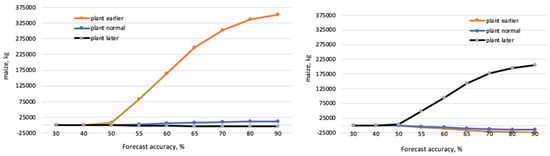 Farmers interacting through their network connections results in 23% more adoption rates if they are at least twice more connected [64]. Doubling the farmers’ interactions would also bring about 175,000 to 300,000 more kg of maize under favorable conditions if farmers behave according to weather forecast information (Figure 8).