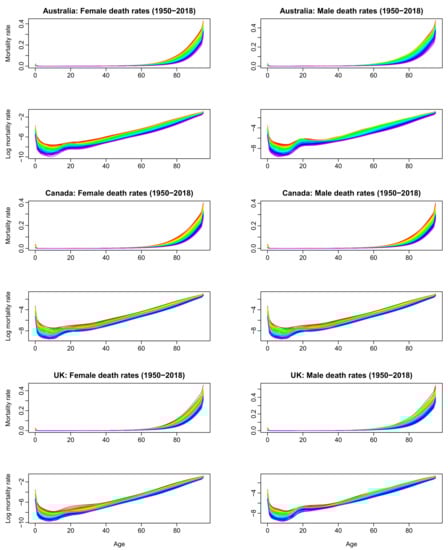 We study the age-specific mortality rates of three countries; Australia (from 1921 to 2018), Canada (from 1921 to 2019), and the United Kingdom (UK) (from 1922 to 2018), obtained from the Human Mortality Database (https://www.mortality.org/ (accessed on 31 January 2022)). The Human Mortality Database includes age-specific mortality rates for 41 countries. These three countries (i.e., Australia, Canada, and the UK) are selected because they have high data quality. In the datasets, the observations are yearly mortality curves from ages 0 to 110+ (110+ denotes ages at and beyond 110). Here, age is treated as the continuum in the mortality curves. For each dataset, we only consider the data from 1950 to 2018 to avoid possible abnormal death rates before 1950 due to the two world wars and the Spanish flu pandemic. There are some years where missing values occur for ages between 96 and 100. In addition, erratic death rates can be observed at and beyond age 95. Thus, we only consider ages from 0 to 95+, where the last age group includes those at and beyond 95. For each sex in a given year, the observed log mortality curves are smoothed via the penalized regression splines with a monotonically increasing constraint after the age of 65 (see, e.g., Hyndman and Ullah, 2007, Hyndman and Shang, 2010 [19,35]). In more detail, we assume that each observed log mortality curve , for , is characterized by a smooth function and a random error term with mean zero and unit variance as