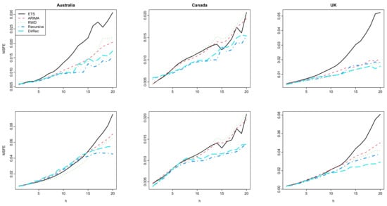 This section presents the forecast accuracy of the proposed machine learning-based FTS methods. Compared with the recursive and DirRect strategies, the direct strategy has the worst forecasting performance, requiring more computing time. Thus, we only present the results for the recursive and DirRect strategies. We compare the forecast accuracy of the proposed methods with four commonly used traditional time series-based FTS methods; exponential smoothing (ETS), random walk (RW), and random walk with drift (RWD) using the R package ftsa Hyndman and Shang (2021) [37] and autoregressive integrated moving average (ARIMA) using the R package demography Hyndman (2019) [38]. RW fails to produce good forecast accuracy results compared with other methods (its results are even worse than those of direct strategy); thus, its results are discarded from the paper. The R code for the proposed methods can be obtained from the authors upon request.