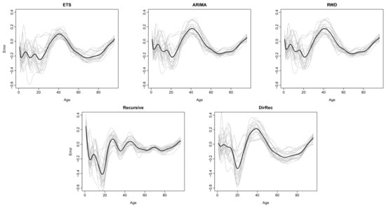 To support our findings, we present 20-step-ahead forecast errors functions and the histograms of pointwise 20-step-ahead forecast errors obtained from the Australian female log mortality dataset in Figure 4 and Figure 5, respectively. From these figures, the error functions obtained by the recursive strategy are closer to zero than those of other methods. In other words, the proposed recursive-based FTS method comparably produces smaller forecast errors than other methods. The proposed DirRec and the existing RWD- and ARIMA-based methods produce similar error functions, resulting in the second-best methods. The ETS-based FTS method produces the worst (i.e., furthest from zero). In addition, from Figure 4, it is evident that the error functions obtained from the proposed recursive-based FTS method follow a more similar structure compared with those of other methods. In addition, compared with other methods, the error functions of the recursive-based FTS method for the age range 0–20 show less variation. These results indicate that the proposed recursive-based FTS method produces a more consistent forecast than the other methods. From the histograms of the pointwise forecast errors (see Figure 5), the distribution of the pointwise error terms obtained from the proposed methods shows a more similar structure to the normal distribution with mean zero than the distribution of the pointwise errors obtained by the classical FTS methods. Given that the error process in an FTS is assumed to follow a normal distribution with mean zero (see, e.g., Section 3), the results presented in Figure 4 and Figure 5 indicate that the proposed methods not only produce improved forecast (i.e., smaller forecast errors) than the traditional FTS methods, but they also fulfill the underlying model assumption.
