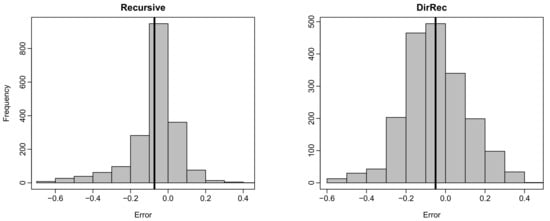 When comparing these two strategies, the recursive strategy tries to match the forecasting and assumed models as much as possible. On the other hand, the direct strategy does not. In addition, contrary to the recursive strategy, which minimizes one-step-ahead forecast errors, the direct strategy considers minimizing h-step-ahead forecast errors. Moreover, the direct strategy requires more computing time than the recursive strategy, since the former one estimates h models rather than the one model that the recursive strategy estimates.