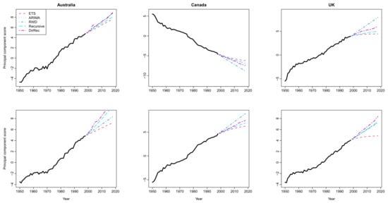 The difference between the forecast accuracy of the methods in the results in Figure 2, Figure 3, Figure 4 and Figure 5 is mainly based on the forecasts of the principal component scores. A graphical display of the forecasted principal component scores obtained by all the methods from the log mortality datasets is presented in Figure 6. This figure shows that the overall trend of the principal component scores is better captured by the forecasts obtained from the machine learning-based methods than those of the classical time series methods. This result, in turn, causes the proposed methods to produce improved forecasts than the traditional FTS methods. In more detail, the forecasted principal component scores in Figure 6 can be seen as an indication of the point forecast accuracy results of the methods presented in Figure 2 and Figure 3. For example, from Figure 6, the forecasted principal component scores of the ETS-based FTS method are far from those of other methods (and far from the general trends of the time series of principal component scores) for datasets from Australia and the UK. These results lead to worse forecasting accuracy for the ETS-based FTS method, as can be seen from Figure 6. On the other hand, the ETS-based method produces relatively closer forecasts for the principal component scores to those of the other two traditional FTS methods for the datasets from Canada. The reflection of this result can be seen in Figure 2 and Figure 3 so that all the traditional FTS methods produce similar forecast accuracy results.