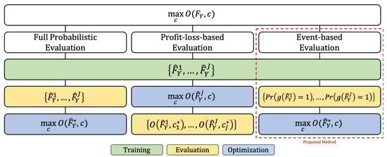where Y, with multivariate distribution function , represents the source of uncertainty, and c denotes the variables to be optimized. Figure 1 summarizes the considered forecast evaluation approaches. Given a collection of forecasts , the forecast user can fully evaluate each individual model using and use the best model’s forecast to solve (full probabilistic evaluation). Alternatively, the optimization problem can be solved for each forecast , and the resulting collection of objectives is used to evaluate the forecasting models (profit–loss-based evaluation). The first approach has two deficiencies. First, the reliable evaluation of a multivariate distribution forecast constitutes a challenging problem in its own right. Second, the approach may involve the implicit assessment of a model’s ability to capture a characteristic of the distribution irrelevant to the optimization problem at hand. Yet, apart from being computationally expensive, the second approach does not involve the direct evaluation of the distribution forecasts. Consequently, the present paper considers a third approach (event-based evaluation). An event that captures the relevant characteristic of the distribution is defined, where the event constitutes a mapping from the support of the multivariate distribution to a binary outcome. The probability of the event’s occurrence is derived, and the evaluation of the collection of probability forecasts allows for the identification of to solve . Two exemplary profit-maximization problems motivated by the daily operation of a risk-neutral energy trading company are considered, a pumped-hydro storage plant problem and a renewable energy trading problem. We apply a probabilistic forecasting scheme using ensemble forecasts and evaluate them by the aforementioned approaches.