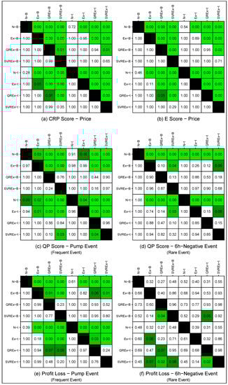 p-Values of pairwise DM Tests: (a) CRPS-based DM Tests for Electricity Price Forecasts; (b) ES-based DM Tests for Electricity Price Forecasts; (c) QPS-based DM Tests for Pump Event; (d) QPS-based DM Tests for 6h-Negative Event; (e) Profit–Loss-based DM Tests for Pump Event; (f) Profit–Loss-based DM Tests for 6h-Negative Event.