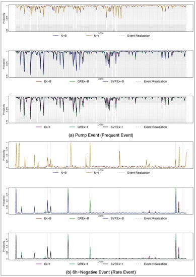 Probability Forecast and Realization Time Series for Events: (a) Probability Forecast Time Series per Model for Pump Event; (b) Probability Forecast Time Series per Model for 6h-Negative Event.