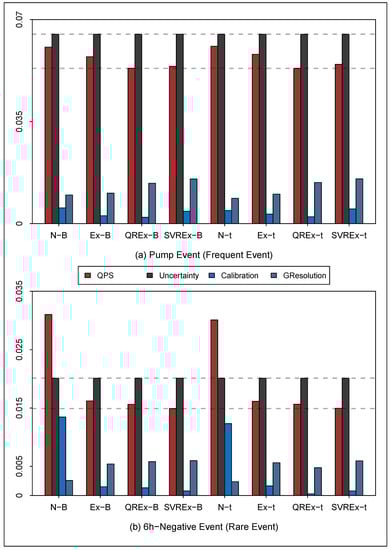 The MD provides further insights into the deficiencies of the considered forecasting models. Figure 4 shows the QPS and its respective components from the MD for both events. It should be noted that the uncertainty component, being derived from the event indicator series over the out-of-sample period, is the same across all models for a given event. For the pump event, all considered specifications succeed in reducing uncertainty. In addition, the SVR-based and QR-based models achieve higher generalized resolution than all other models, implying that they are more able to distinguish between the respective cases of the event. As the QR-based models exhibit the lowest level of miscalibration, they achieve the lowest QPS values overall. Interestingly, the SVR-based models achieve higher levels of generalized resolution but only at the cost of higher miscalibration. For the 6h-negative event, we find that the naive specifications increase the QPS above uncertainty, due to substantial miscalibration. Conversely, the expert-based specifications succeed in reducing the uncertainty. Within that class, the SVR-based models together with QREx-t are the least miscalibrated with slightly higher generalized resolutions, implying that, overall, the issued forecasts correspond well with the realization of the event and that the models are most effective in using the provided information to distinguish cases of occurrence and non-occurrence of the event.