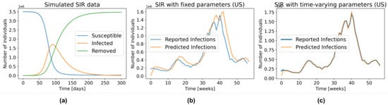 Figure 1c, on the other hand, was created by allowing and to change every week. Here, we first found the parameters that fit the data from 29 March 2020 to 4 April 2020—call them and —then used those parameters along with the SIR state on 28 March 2020 to predict the number of new infections one week ahead—i.e., the sampled week of 29 March 2020 to 4 April 2020. By repeating this procedure during the entire time series we obtained an almost perfect fit to the data. Of course, these are also not “legal” predictions since they too use information that is not available at prediction time—i.e., they used the number of reported infections during this first week to find the parameters, which were then used to estimate the number of cases over this time. However, this “cheating” example shows that an SIR model, with the optimal time-varying parameters, can model the complex dynamics of COVID-19. Recall from Figure 1b that this is not the case in the SIR model with fixed parameters, which cannot even properly fit the training data.