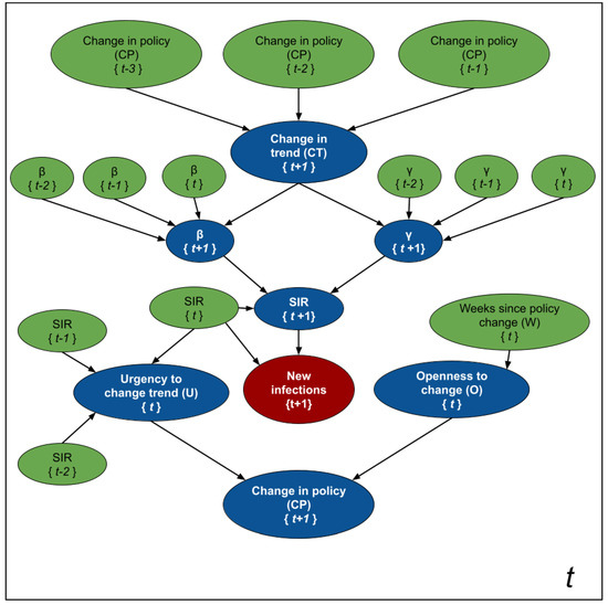 While Figure 2 is an schematic diagram used for pedagogical purposes; Figure 3 depicts the formal probabilistic graphical model, as a plate model, that we use to estimate the parameters of the SIR model, the number of new infections, and the likelihood of observing changes in policies 1 to 4 weeks in advance. The blue nodes are estimated at every time point, while the values of the green nodes are either known as part of the historical data, or inferred in a previous time point. The random variables are assumed to have the following distributions: