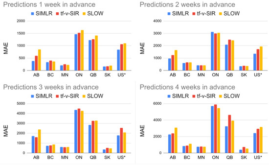 We evaluated the performance of SIMLR, in terms of the mean absolute percentage error (MAPE) and mean absolute error (MAE), for forecasting the number of new infections one to four weeks in advance, in data from United States (as a country and individually for every state) and the six biggest provinces of Canada: Alberta (AB), British Columbia (BC), Manitoba (MN), Ontario (ON), Quebec (QB), and Saskatchewan (SK). For each of the regions, the predictions are done on a weekly basis, over the 39 weeks from 26 July 2020 to 1 May 2021. This time span captures different waves of infections. Equation (7) show the computation of the metrics used for evaluating our approach.