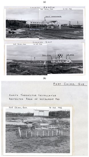 Photographs taken during the installation of earth thermistors by Environment Canada’s staff at Kuujjuaq (formerly known as Fort Chimo) on 14 October 1966 [19]. The pictures depict (a) the surrounding environment and the buildings of the weather station; (b) the location and ground conditions where the soil temperature instruments were installed.