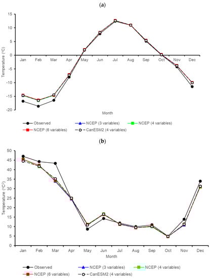 Comparison between the observed monthly 50 cm soil temperature and the predicted values from the CanESM2 and NCEP models for: (a) mean; (b) variance.