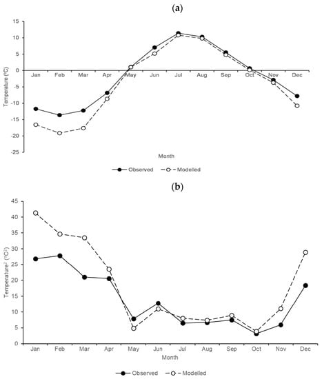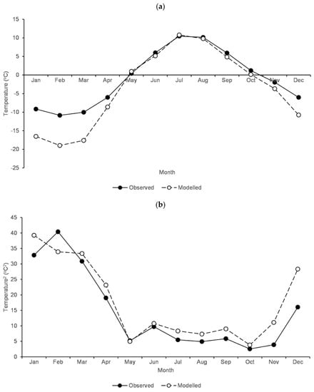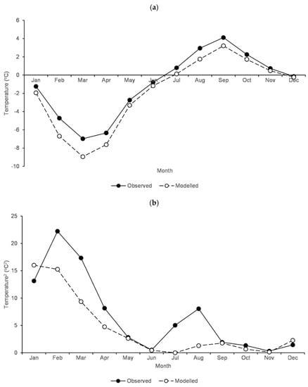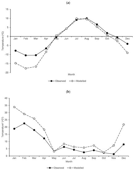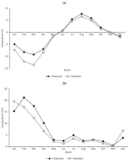 The modelling efficiency formula (MEF; Equation (1)) evaluates the performance of the SDSM model output of daily soil temperature data based on selected variables and compare that to the observed average [32]. MEF generates a value between −1 and +1. A positive MEF value closer to +1 indicates that the modelled values were a close match with the observed values. A value of zero indicates that the model’s predicted value was no better than the observed average value. A negative value indicates the observed average value was better than the model’s individual predicted values. Other common model evaluation methods: root mean square error (RMSE; Equation (2)) and mean absolute error (MAE; Equation (3)). A lower RMSE and MAE value would indicate a more accurate model because the predicted values were closed to the observed values (and vice versa). This validation exercise is repeated for all depths.