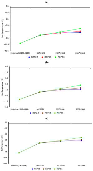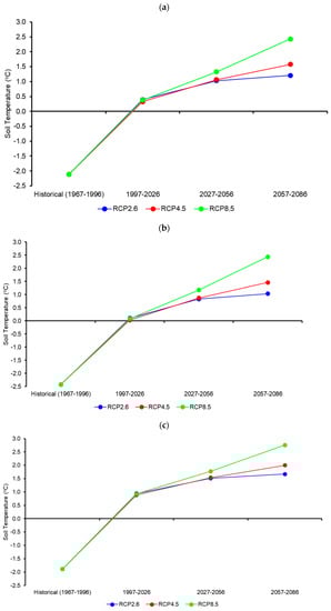 Under projected warming (Figure 9), the annual soil temperature would be above 0 °C in the first projection period (1997–2026). In the second projection period (2027–2056), the warming rate will be similar for RCP 2.6 and RCP 4.5 scenarios while RCP 8.5 would have the greatest warming rate. The warming rate for RCP 8.5 in the third projection period (2057–2086) is further enhanced while RCP 4.5’s warming rate will be progressing at approximately the same rate as between the first and second projection periods. RCP 2.6 scenario’s warming rate slows down in the third projection period, which is largely explained by a reduction in global greenhouse gas emissions after 2020 [39]. A combination of reduction in fossil fuel consumption, government policy implementations to drastically reduce greenhouse gas emissions, improved efficiencies in existing technologies (e.g., automobiles and heating) and new technologies (e.g., carbon capture and storage) would lead to reduced radiative forcing in the atmosphere and cause lesser warming starting from second projection period. Winter projection trends in different RCP scenarios were similar to the annual’s corresponding RCP trends (Figure 9). For RCP 4.5 and RCP 8.5 scenarios, Phillips et al. [46] suggested that the slowdown in the warming rate across different scenarios may be explained by soil drying. They found that under RCP 4.5 and RCP 8.5, 15 CMIP5 models showed soil temperature warming at a rate of 10% less than air temperature. They also hypothesized that soil drying leads to reduced thermal conductivity and heat capacity in the soil. However, after soil was dried, there would be more warming from sensible heat than latent heat as evaporation decreased.