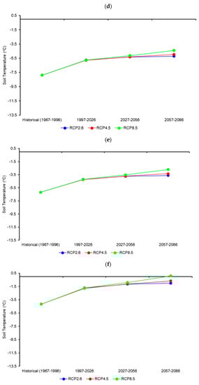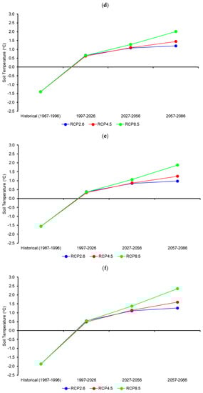 Annual soil temperature projections from 1997 to 2086 for depths at: (a) 5 cm; (b) 10 cm; (c) 20 cm; (d) 50 cm; (e) 100 cm; (f) 150 cm.