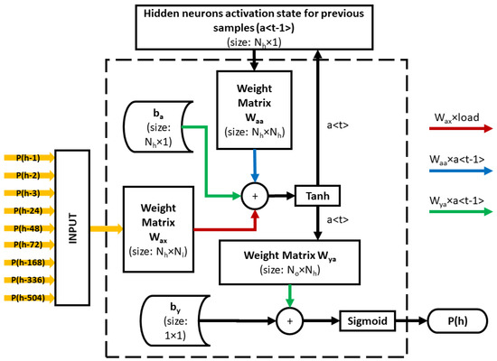 In this study, RHM-1 is designed to predict the load based on the last three hours of load, load at the same time for the last three days and loading at the same time but for the last three weeks. The architecture for the proposed RNN model is shown in Figure 1.