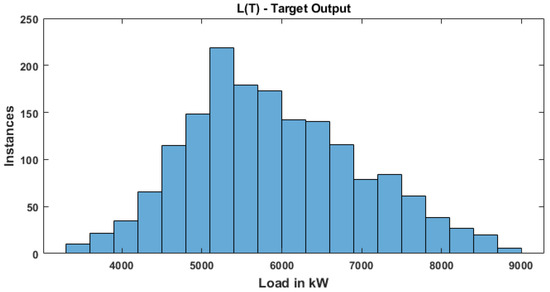 Data was captured from [28] to train and test the models. This load data consists of a total of 2184 samples (91 days × 24 h) and these data are rearranged into a 1680, i.e., matrix. The first nine columns represent nine input features, whereas the 10th column represents target output (load). Statistical features of the load dataset that have been used to train the RNN model is presented in Table 3. The frequency distribution of output load data values is represented in terms of histogram plot as shown in Figure 3,