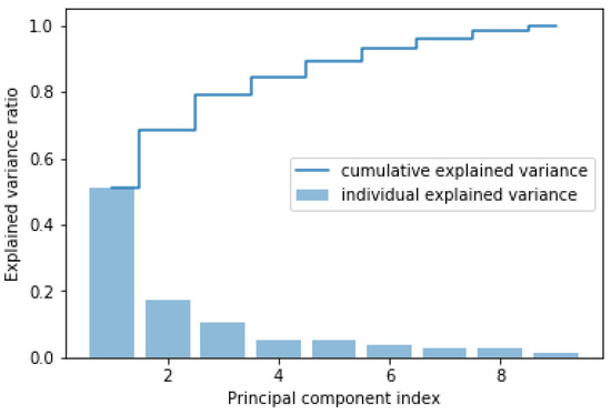 The PCA algorithm is applied to the input features of the load dataset to find the principal components. Load dataset consists of a total of 6 input features, i.e., , , , , and , and one output . The total variance in the dataset covered by each principal component and the cumulative variance covered are shown in Figure 5. Figure 5 shows that four principal components cover almost 90% of the variance in the load dataset. Thus, six input features, i.e., , , , , and for each dataset sample, are translated into four principal components. These four principal components were used to train the RDM-2. RDM-2 was therefore equipped with four input neurons and one output neuron.