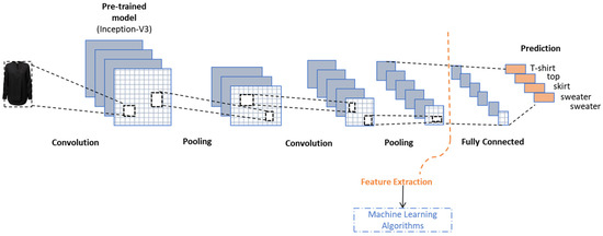 In this study, deep learning is used for extracting product image features using CNN. The extracting feature is the dimensionality reduction of an image that signifies an image’s portions as a feature vector, as illustrated in Figure 2. Image features were extracted using a pre-trained deep learning inception v3 model [33]. This model has been chosen as it is trained on more than 1000 objects, which include fashion clothes and product images. The inception V3 model has outperformed the previous image recognition deep learning models ([33]).