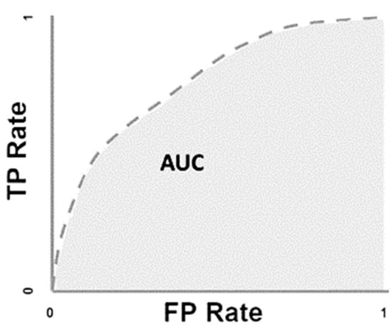 - AUC (Area Under the Curve): It measures the aggregated area under the ROC curve, and it comparatively evaluates the performances of different classification models. AUC threshold values range from (0, 0) to (1, 1), as represented in Figure 5. The value of AUC ranges from 0 to 1. The higher the value, the better the classification performance of the model.