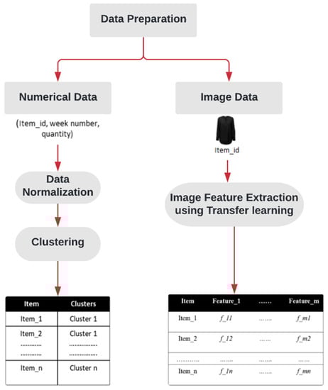 To accomplish data pre-processing, data normalisation was performed, which was essential to transform the data into a structured form that can be used for modelling. Hence, data pre-processing was carried out in two steps. First, a new feature was created using historical sales information of the product and secondly, image features were extracted using Inception V3, explained in Section 3.2, using image data, and the steps are illustrated in Figure 6.